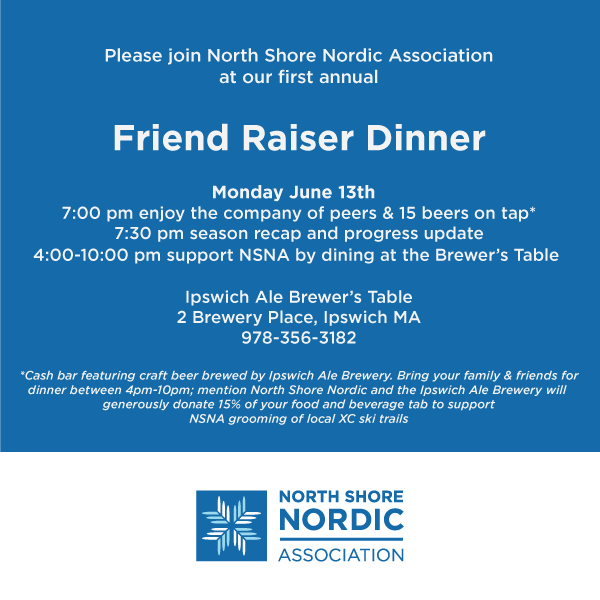 Bring family & friends for dinner between 4:00pm and 10:00pm; mention North Shore Nordic and Ipswich Ale Brewery will generously donate 15% of your food and beverage tab to NSNA.